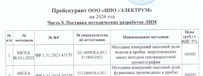 | - | Поставка переаттестованной методики взамен аналогичной методики ООО "НПО "ЭЛЕКТРУМ", приобретённой не более 5 лет назад | 33 000 | ||||