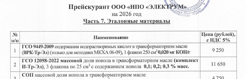 | 12 | СОП состава и свойств трансформаторного масла (СОП М-Тр-Эл), 1 бутылка (1 дм3) | 15 000 |
